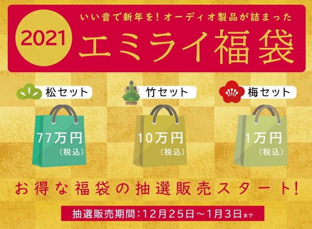 HOME > ニュース > AV&ホームシアターニュース エントリー期間は1月3日まで エミライ取り扱いブランドが詰まった「エミライ福袋」直販ストアにて抽選販売開始 編集部:松永達矢 2020年12月25日 2021年エミライ福袋 この写真の記事へ 関連リンク 福袋販売ページ(楽天ショッピング) 福袋販売ページ(Yahoo!ショッピング) エミライ