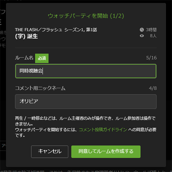 ホストユーザーがウォッチパーティーのルームを作成、参加者はルームURLとキーを入力すると参加できる