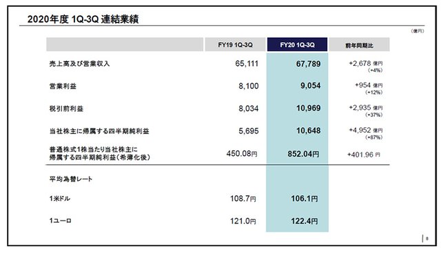 HOME > ニュース > AV&ホームシアターニュース 2020年度第3四半期決算を発表 ソニー、1兆円超えの純利益。ゲーム分野好調、通期見通しも大幅に上方修正 ファイルウェブ編集部 2021年02月03日 次の写真へ 2020年度第3四半期連結業績 一覧表 次の写真へ この写真の記事へ 関連リンク ソニー 2020年度 第3四半期 決算資料