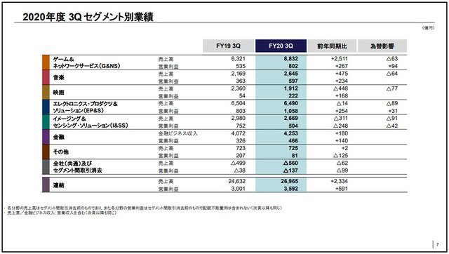 HOME > ニュース > AV&ホームシアターニュース 2020年度第3四半期決算を発表 ソニー、1兆円超えの純利益。ゲーム分野好調、通期見通しも大幅に上方修正 ファイルウェブ編集部 2021年02月03日 前の写真へ 第3四半期セグメント別業績 前の写真へ この写真の記事へ 関連リンク ソニー 2020年度 第3四半期 決算資料