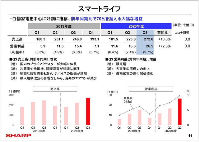 シャープ、'20第3四半期はさらに収益回復。白物家電等が好調に推移し大幅な増益へ