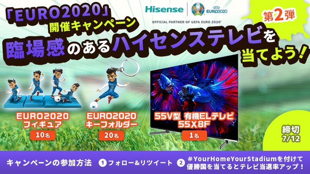 HOME > ニュース > AV&ホームシアターニュース 応募はTwitterから ハイセンス、「EURO 2020」開催記念キャンペーン第2弾。4K有機ELテレビやオリジナルグッズが当たる 編集部:成藤 正宣 2021年07月01日 ハイセンスジャパンが「UEFA EURO 2020」開催キャンペーン第2弾が実施 この写真の記事へ 関連リンク ハイセンスジャパン公式Twitter ハイセンスジャパン