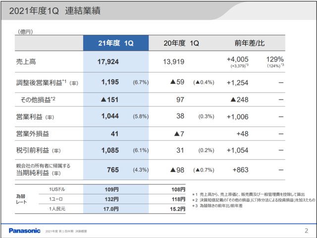 パナソニック、21年1Q決算は大幅増収増益。アプライアンスとインダストリアルソリューションズが牽引、コロナ影響から回復