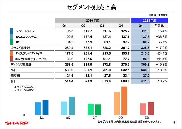シャープ21年度1Q決算、高付加価値化を推進した白物やテレビが伸びて前年同期から大幅伸長