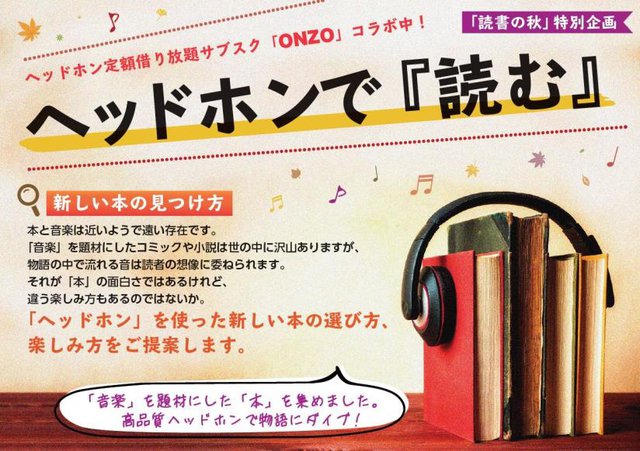 HOME > ニュース > AV&ホームシアターニュース ヘッドホンサブスク「ONZO」コラボ マンガ/小説に登場する音楽を実際に聴けるイベント「ヘッドホンで読む」。10/11から 編集部:小野佳希 2021年10月08日 会場は明文堂書店TSUTAYA レイクタウン この写真の記事へ 関連リンク 明文堂書店TSUTAYA レイクタウン ONZO