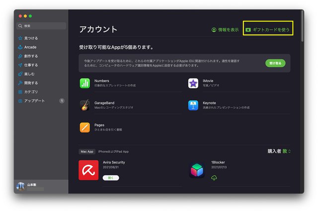 Macの場合もApp Storeアプリを開いてから、右上の「ギフトカードを使う」を選択。コードを登録する