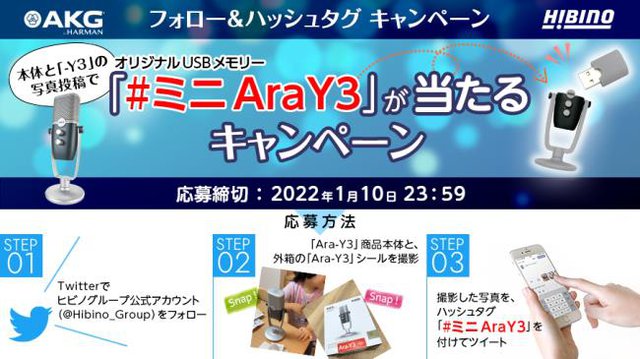 HOME > ニュース > AV&ホームシアターニュース 公式Twitterフォロー&写真投稿で応募 AKG、マイク「Ara-Y3」型のオリジナルUSBメモリーが当たるTwitterキャンペーン 編集部:成藤 正宣 2021年12月10日 次の写真へ 公式Twitterをフォローし、条件を満たす写真およびハッシュタグを付けたツイートで応募 次の写真へ この写真の記事へ 関連リンク キャンペーン詳細 「Ara-Y3」製品詳細