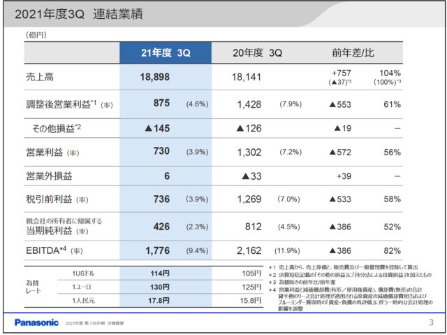 HOME > ニュース > AV&ホームシアターニュース 巣ごもりの需要増からの反動や原材料高騰など影響 パナソニック2021年度3Q決算は減益、国内家電の価格改定も視野に PHILEWEBビジネス 徳田ゆかり 2022年02月02日 前の写真へ 次の写真へ 2021年度3Qの連結業績 前の写真へ 次の写真へ この写真の記事へ 関連リンク パナソニック