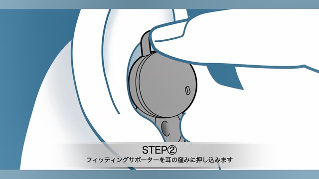 フィッティングサポーターで耳のくぼみあたりを押さえるようにして固定する(装着方法解説動画より抜粋)