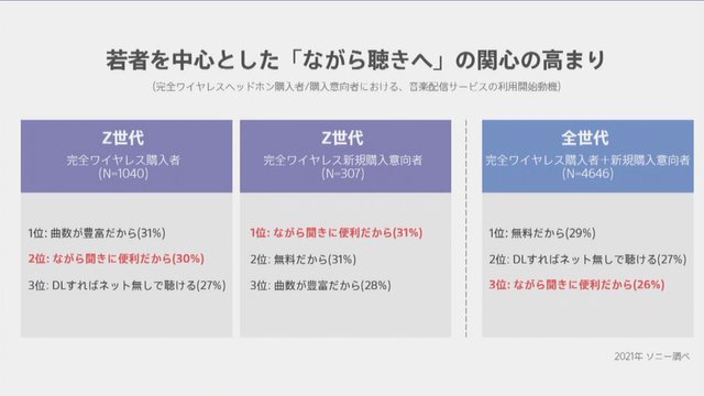 HOME > ニュース > AV&ホームシアターニュース NianticやSpotify担当者も登壇 ソニーの新完全ワイヤレス「LinkBuds」は「サービスも重要」。“新しい音体験”創造を目指す 編集部:平山洸太 2022年02月16日 前の写真へ 次の写真へ Z世代でながら聴きが流行 前の写真へ 次の写真へ この写真の記事へ 関連リンク ソニー、穴あきドライバー搭載の“ながら聴き”完全ワイヤレス「LinkBuds」 ソニー、『ポケモンGO』のNianticと協業発表。聴覚でも楽しめるARゲームの実現に向けて 「LinkBuds」製品詳細