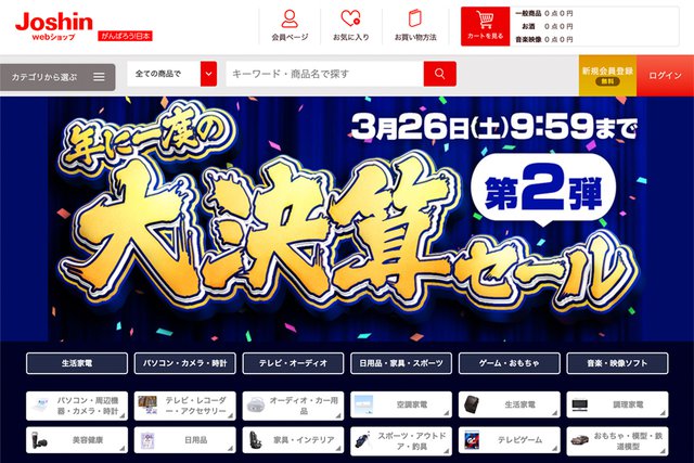 HOME > ニュース > AV&ホームシアターニュース 3月26日9時59分まで ジョーシンweb、「年に一度の大決算セール」第2弾。有名メーカー製テレビや家電、ゲームソフトもお得に PHILE WEB編集部 2022年03月14日 次の写真へ 「年に一度の大決算セール」 次の写真へ この写真の記事へ 関連リンク セール会場はこちらから
