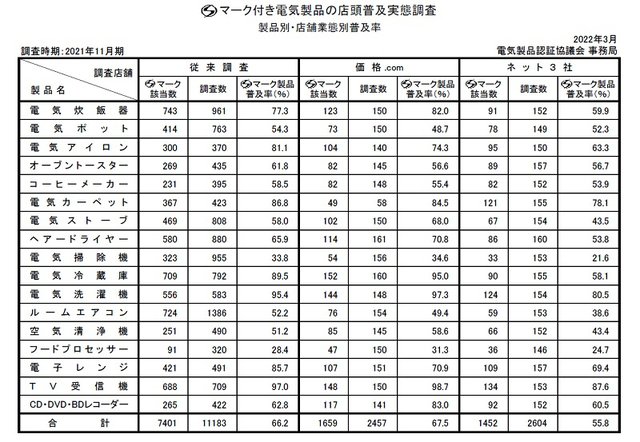 HOME > ニュース > AV&ホームシアターニュース 身近に潜む電気製品事故を未然に防ぐ 拡大するネット通販も課題、「第三者認証Sマーク」が担う役割はますます重要に PHILE WEB ビジネス編集部・竹内純 2022年04月21日 前の写真へ 次の写真へ Sマークの店頭普及実態調査は昨年よりネット販売まで対象を広げて行われている 前の写真へ 次の写真へ この写真の記事へ 関連リンク 電気製品認証協議会(SCEA)/Sマーク 一般財団法人 電気安全環境研究所(JET) 一般財団法人 日本品質保証機構(JQA) 株式会社UL Japan テュフ・ラインランド・ジャパン株式会社
