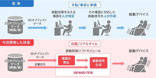HOME > ニュース > AV&ホームシアターニュース 映像/音響信号からタイミングを検出して自動生成 デンソーテン、車載向けのリアルタイム振動技術を新開発。座席やシートを震わせて周辺状況や進路方向を通知 編集部:川田菜月 2022年04月26日 映像/音響信号からタイミングを検出、その場で自動生成 この写真の記事へ 関連リンク 本件のニュースリリース