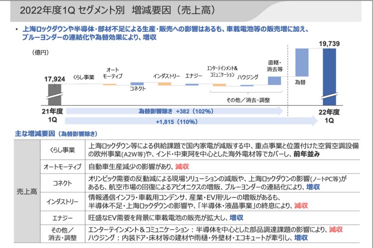 HOME > ニュース > AV&ホームシアターニュース 部材不足や物流費高騰への影響軽減を図る パナソニックホールディングス、2022年度1Q決算は経営環境変化による影響が響き減益に PHILEWEBビジネス編集部 2022年07月28日 前の写真へ セグメント別 売上高の増減要因 前の写真へ この写真の記事へ 関連リンク パナソニックホールディングス株式会社