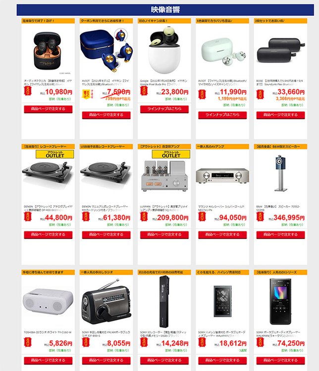 HOME > ニュース > AV&ホームシアターニュース ピュアオーディオ製品もセール対象に ノジマオンライン「お盆セール」8/22まで。4Kテレビ/完全ワイヤレス/ウォークマン/PCなど安く ファイルウェブ編集部 2022年08月15日 セール対象品リストの一部 この写真の記事へ 関連リンク セールページ