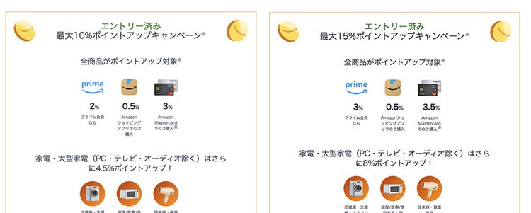 HOME > ニュース > AV&ホームシアターニュース アクセスするまで分からない Amazonポイントアップの還元率、最大10%の人と15%の人がいる!あなたはどっち? PHILE WEB編集部 2022年08月27日 最大10%と15%が存在する この写真の記事へ 関連リンク ポイントアップキャンペーンの詳細はこちら
