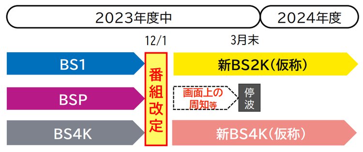 HOME > ニュース > AV&ホームシアターニュース BS放送波の削減案詳細が明らかに NHK、BSプレミアムを2024年3月末で停波。「新BS2K」「新BS4K」の2チャンネル体制に 編集部:小野佳希 2022年10月11日 前の写真へ BSチャンネル削減のスケジュール 前の写真へ この写真の記事へ 関連リンク 本件の詳細(PDF)