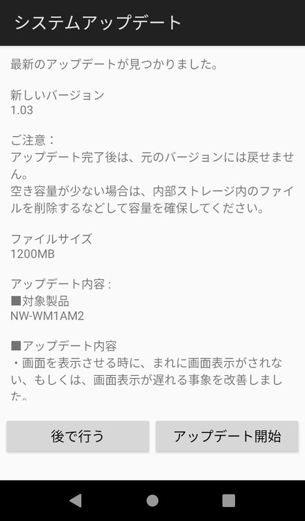 HOME > ニュース > AV&ホームシアターニュース 画面表示されない/表示が遅れるトラブルに対応 ソニー、ウォークマン「NW-WM1ZM2/WM1AM2」に画面表示改善のアップデート 編集部:成藤 正宣 2022年10月13日 前の写真へ アップデートは本体メニューからのWi-Fi経由などで行える(画像はNW-WM1AM2のもの) 前の写真へ この写真の記事へ 関連リンク ウォークマン アップデート情報 「NW-WM1ZM2」製品詳細