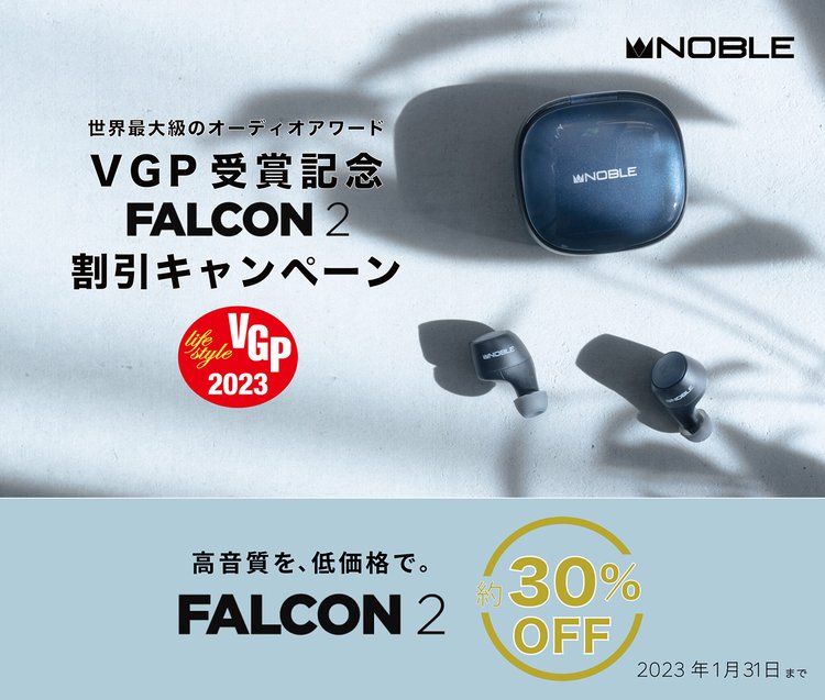 HOME > ニュース > AV&ホームシアターニュース 2023年1月31日まで Noble Audio、完全ワイヤレス「FALCON2」のVGP受賞を記念した割引キャンペーン 編集部:伴 修二郎 2022年11月18日 前の写真へ 「VGP受賞記念!FALCON2 割引キャンペーン」 前の写真へ この写真の記事へ 関連リンク キャンペーンの詳細 「FALCONシリーズ」詳細 Noble Audio