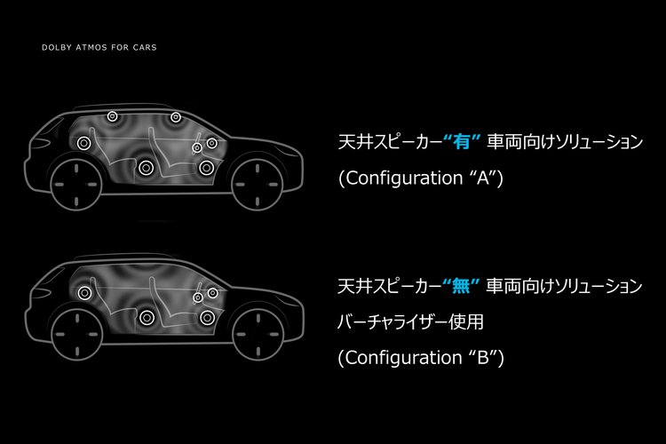 Dolby Atmos for Carsには、天井スピーカーを使用して再生するConfiguration A、バーチャライザーを使用するConfiguration Bの再生方法を用意
