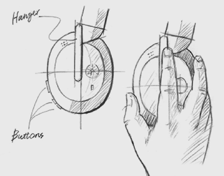 装着時にはハンガー部に自然と人差し指が触れ、装着の目印となる仕掛け