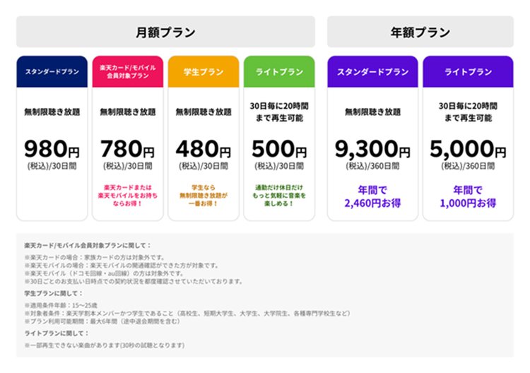 HOME > ニュース > AV&ホームシアターニュース 15歳〜25歳/学生が対象 Rakuten Music、480円の「学生プラン」 編集部:伴 修二郎 2023年02月02日 前の写真へ 「学生プラン」を含んだ4種類の月額プランと、2種類の年額プランというラインナップに 前の写真へ この写真の記事へ 関連リンク Rakuten Music キャンペーンの詳細