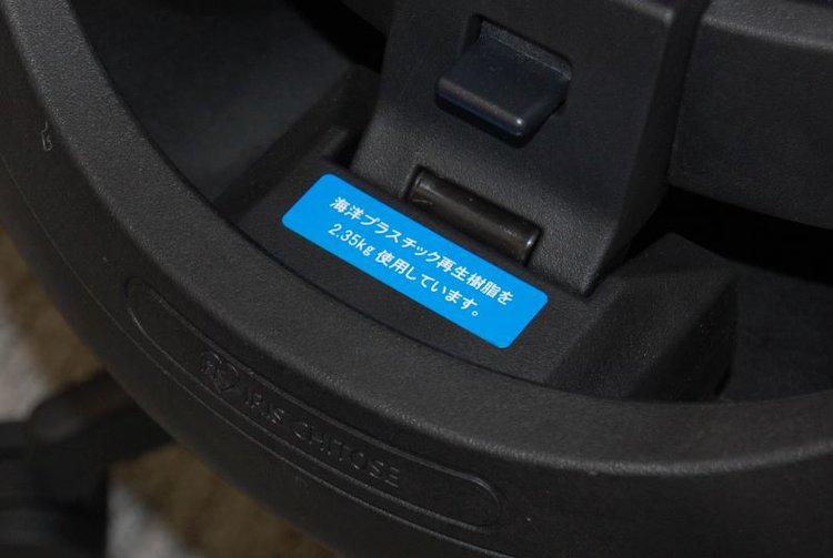 海洋プラスチック再生樹脂を使用したオフィスチェアにはその使用量が記されている