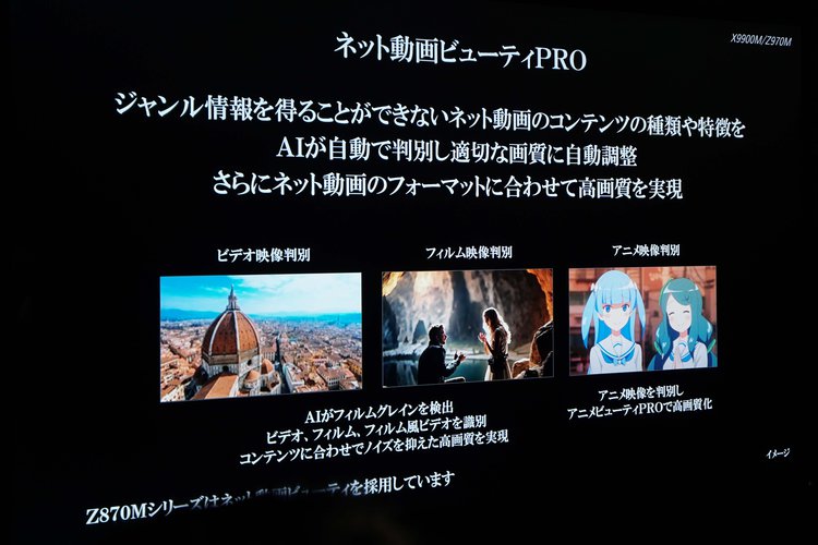 「ネット動画ビューティPRO」では、フィルム映像とビデオ映像、アニメ映像を判別。圧縮ノイズやバンディングを低減させる