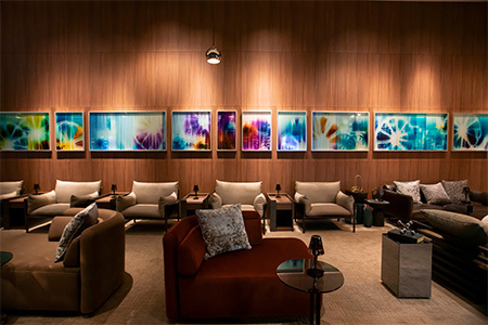 プレミアムラウンジ「OVERTURE」の壁面には竹中美幸氏の作品「ミラノ座の記憶」