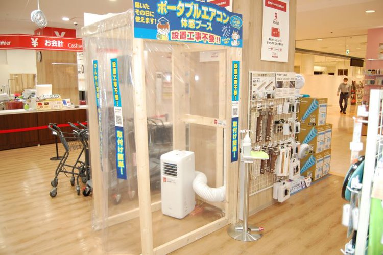注目度の高いポータブルクーラーの体験ブース。効率を高める屋外排気用の窓枠パネルについてもわかりやすく説明している