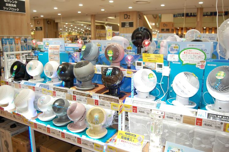 今夏の需要拡大を見込むサーキュレーターを店舗入口通路に面して大きく展開する