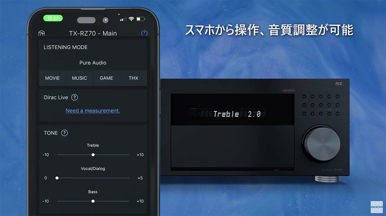 HOME > ニュース > AV&ホームシアターニュース Dirac Liveを標準搭載 オンキヨー、11.2ch対応の最上位AVアンプ「TX-RZ70」。“ブランド史上最高峰の音質”を提供 ファイルウェブオーディオ編集部・筑井真奈 2023年06月14日 前の写真へ スマートフォンからさまざまな音質補正が可能 前の写真へ この写真の記事へ 関連リンク ONKYO「TX-RZ70」