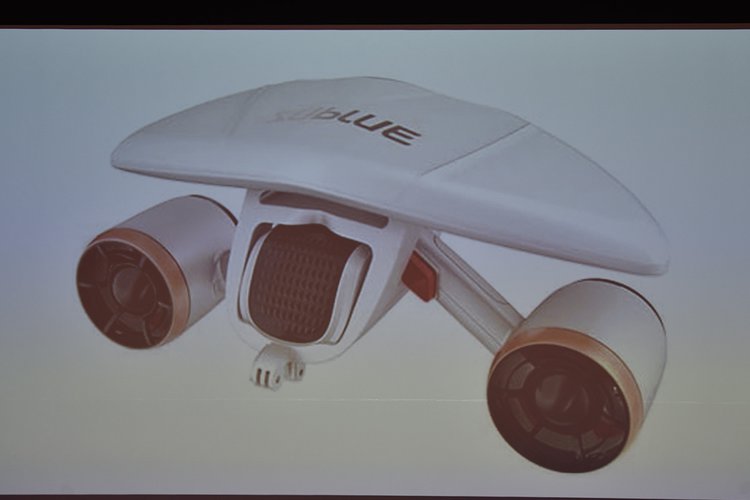 Webムービーにも登場した「水中スクーター」。内臓のモーターで両端に備えられたファンを駆動。本体とファンの間のバーを掴むことで、推力を得ることができる