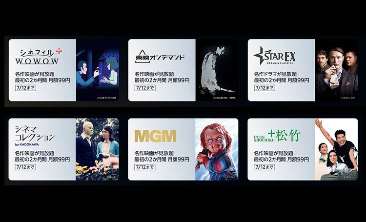 HOME > ニュース > AV&ホームシアターニュース 東映や角川、松竹、MGMも Amazon Prime Video、期間限定で6チャンネルが月額99円に。シネフィルWOWOWなど PHILE WEB 2023年06月25日 対象となる6チャンネル。ふだんは見られないコンテンツをお得に視聴できるチャンスだ この写真の記事へ 関連リンク Amazon Prime Videoで詳細を見る