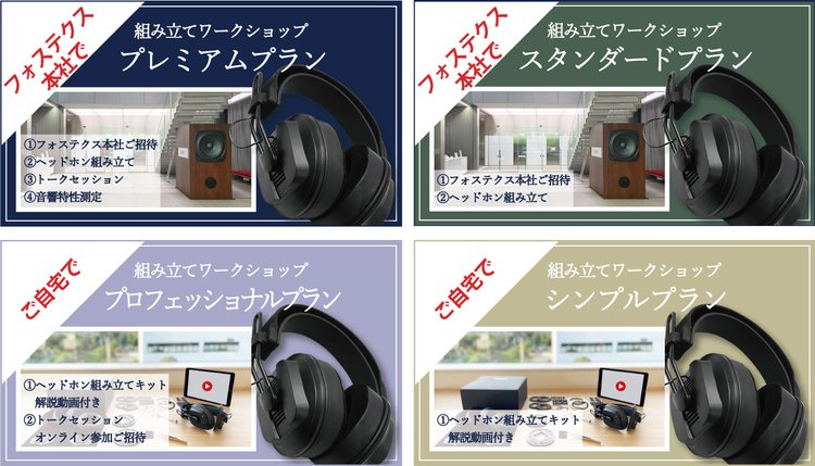 フォステクス本社で行うワークショップ2プランに加え、自宅でヘッドホンを組み立てる解説動画付きプランも