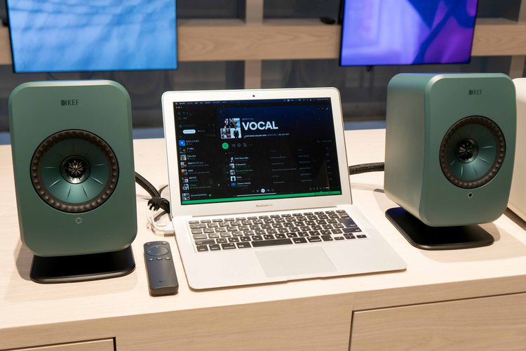 KEF MUSIC GALLERY TOKYOの入り口付近では、LSX II LTの音をデスクトップシステムで試聴できる環境を設置