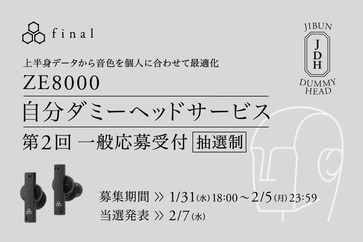 HOME > ニュース > AV&ホームシアターニュース 抽選で12名が当選 final、「自分ダミーヘッドサービス」の第2回応募受付を開始 編集部:押野由宇 2024年01月31日 次の写真へ 第2回応募受付を開始 次の写真へ この写真の記事へ 関連リンク 自分ダミーヘッドサービス紹介ページ
