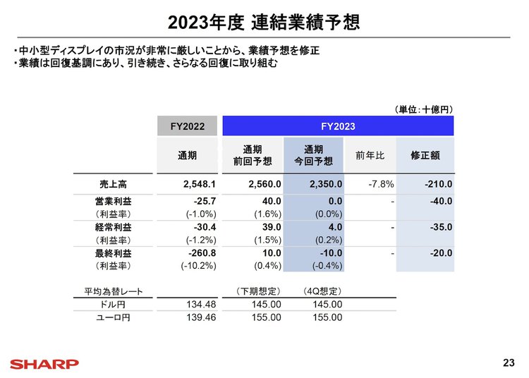 シャープ、2023年度3Q決算。利益回復進むが、市況厳しく通期業績予想は下方修正