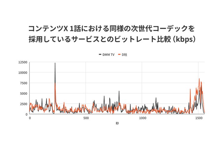 コンテンツX 1話における、同様の次世代コーデックを採用している大手グローバル動画配信サービスとのビットレート比較
