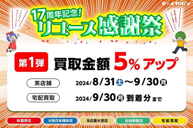 HOME > ニュース > AV&ホームシアターニュース 「リユース感謝祭」第1弾として e☆イヤホン、創業17周年記念の買取価格5%アップキャンペーンを開催。8/31〜9/30まで 編集部 : 伴 修二郎 2024年08月30日 「e☆イヤホン リユース感謝祭! 買取 5%アップキャンペーン」 この写真の記事へ 関連リンク 本キャンペーンの詳細 e☆イヤホン