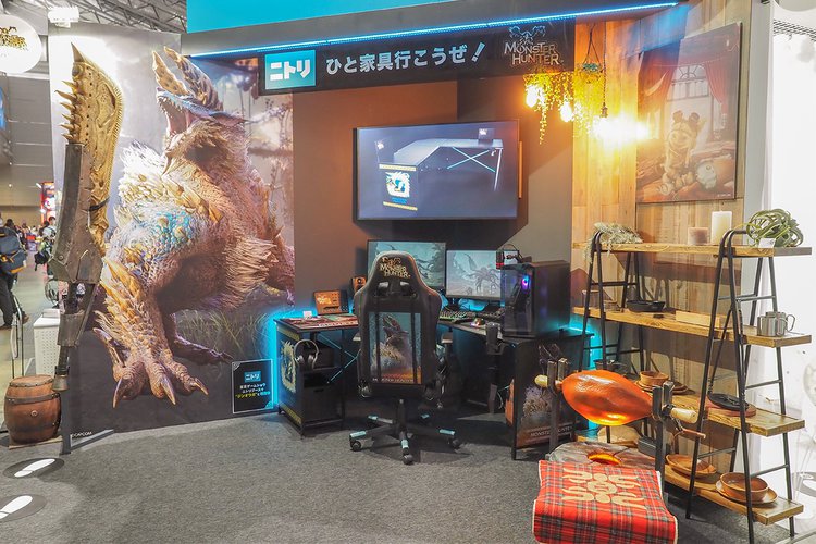 モンハンコラボルームでは『モンスターハンター』とコラボしたチェア/デスク/クッション/デスクマットなどを展示