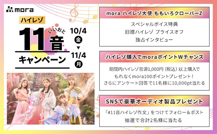 HOME > ニュース > AV&ホームシアターニュース 「mora ハイレゾ11音(いいおと)キャンペーン」第2弾 mora、「ハイレゾ作文」投稿でBluetoothヘッドホンやポータブルUSB-DACをプレゼント。応募は11/4まで 編集部:成藤正宣 2024年10月17日 前の写真へ 「mora ハイレゾ11音(いいおと)キャンペーン」では、ももいろクローバーZをハイレゾ大使として特別企画を展開中 前の写真へ この写真の記事へ 関連リンク 「ハイレゾ作文」企画詳細 「mora ハイレゾ11音(いいおと)キャンペーン」詳細 mora