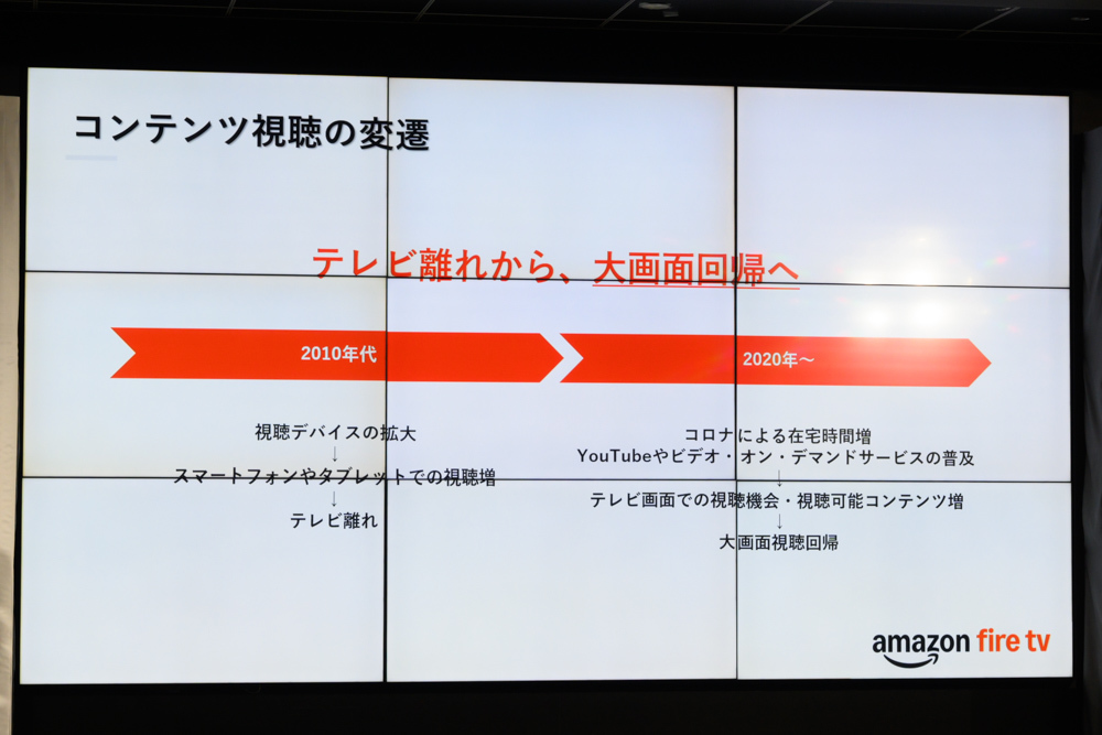 HOME > ニュース > AV&ホームシアターニュース 独自調査をもとにFire TVシリーズの展開強める Amazon、3.1chサウンドバー「Fire TV Soundbar Plus」実機をお披露目。“お茶の間” 復刻の波に乗る 編集部:成藤正宣 2024年12月04日 前の写真へ 次の写真へ 2010年代から指摘されていた “テレビ離れ” が進むどころか、むしろテレビ回帰の傾向が明らかになったという 前の写真へ 次の写真へ この写真の記事へ 関連リンク 「Fire TV Soundbar Plus」 Amazon「令和のお茶の間実態調査」特設ページ