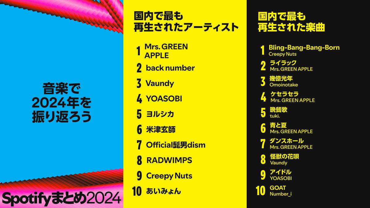 2024年、Spotifyで最も聴かれた邦楽は「Bling-Bang-Bang-Born」。6.4億人以上のデータに基づく年間ランキング発表