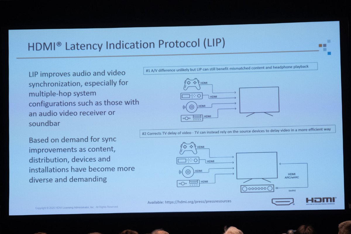 HOME > ニュース > AV&ホームシアターニュース HDMI市場はゲーム分野が牽引 <CES>「HDMI 2.2」発表。96Gbps伝送、16K映像も対応。音ズレ改善技術も採用 ファイルウェブ編集部 2025年01月07日 前の写真へ 次の写真へ 映像と音声の同期を改善する「LIP」 前の写真へ 次の写真へ この写真の記事へ 関連リンク 本件の詳細(PDF) HDMI LA