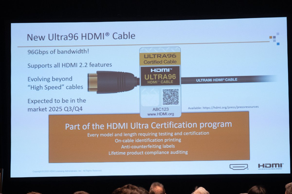 HOME > ニュース > AV&ホームシアターニュース HDMI市場はゲーム分野が牽引 <CES>「HDMI 2.2」発表。96Gbps伝送、16K映像も対応。音ズレ改善技術も採用 ファイルウェブ編集部 2025年01月07日 前の写真へ 次の写真へ HDMI 2.2のスペックを万全に引き出す「Ultra96 HDMIケーブル」も策定された 前の写真へ 次の写真へ この写真の記事へ 関連リンク 本件の詳細(PDF) HDMI LA