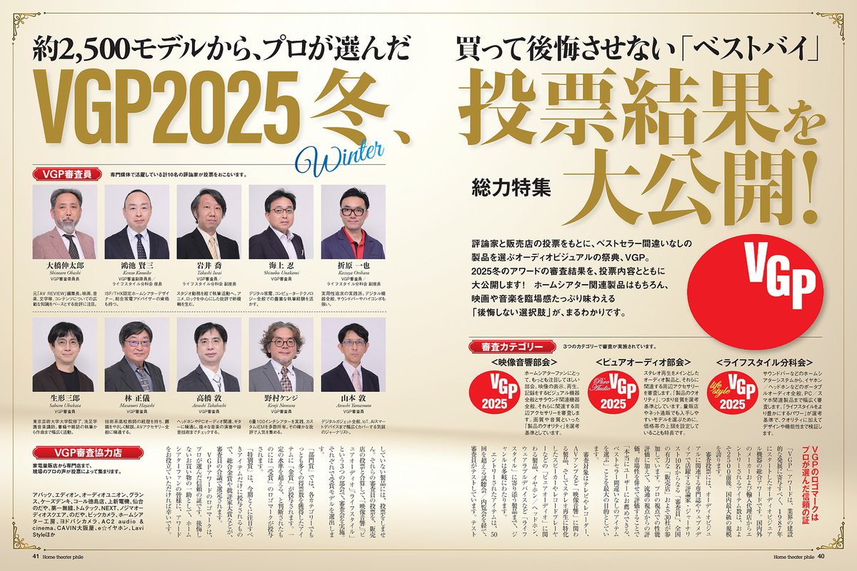 HOME > ニュース > AV&ホームシアターニュース VGP2025の投票結果を大公開! スマートプロジェクターを徹底検証!『ホームシアターファイル 2025 WINTER』本日1/15発売 ホームシアターファイル編集部 2025年01月15日 前の写真へ VGP2025の審査結果を、投票内容とともに大公開! 前の写真へ この写真の記事へ 関連リンク 『ホームシアターファイル 2025 WINTER』