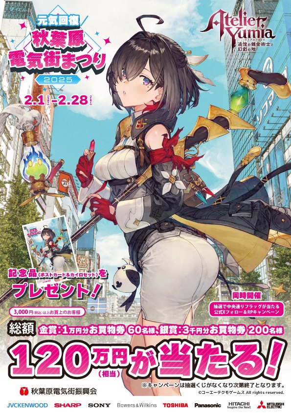 HOME > ニュース > AV&ホームシアターニュース 総額120万円のお買物券が当たる! 人気ゲーム「ユミアのアトリエ」とタイアップ。「元気回復 秋葉原電気街まつり 2025」を2/1から開催 編集部・竹内 純 2025年01月29日 前の写真へ 「元気回復 秋葉原電気街まつり 2025」を2月1日(土)〜2月28日(金)にわたって開催。コーエーテクモゲームス社の人気ゲーム「ユミアのアトリエ」とタイアップする 前の写真へ この写真の記事へ 関連リンク 「元気回復 秋葉原電気街まつり 2025」 秋葉原電気街振興会