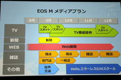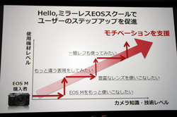 さらに、「良い写真を撮るためには良いカメラ、良いレンズ、知識と技術が必要。“EOS M”でコンパクトデジタルカメラからデジタル一眼レフへの最初のステップを用意できた。知識・技術のステップとしても、新しいステップを用意する」ということで、“EOS M”を使った特別講座「Hello,ミラーレスEOSスクール」を10月から開講することを発表した。これにより、“EOS M”での撮影を楽しんでもらうほか、ユーザーのモチベーションを上げ、さらなる上位モデルへのニーズも喚起する考えだ。