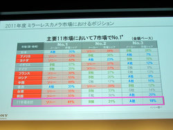 なお、石塚氏はグローバルでのミラーレスカメラにおける同社のポジションにも言及。世界の80%をカバーする主要11市場のうち7市場において金額ベースでのナンバーワンシェアを獲得していることを紹介した。そして別項で紹介している「NEX-6」および「NEX-5R」についても触れ、「フルラインナップで年末商戦を戦ってリーディングポジションを獲得していく」と語った。